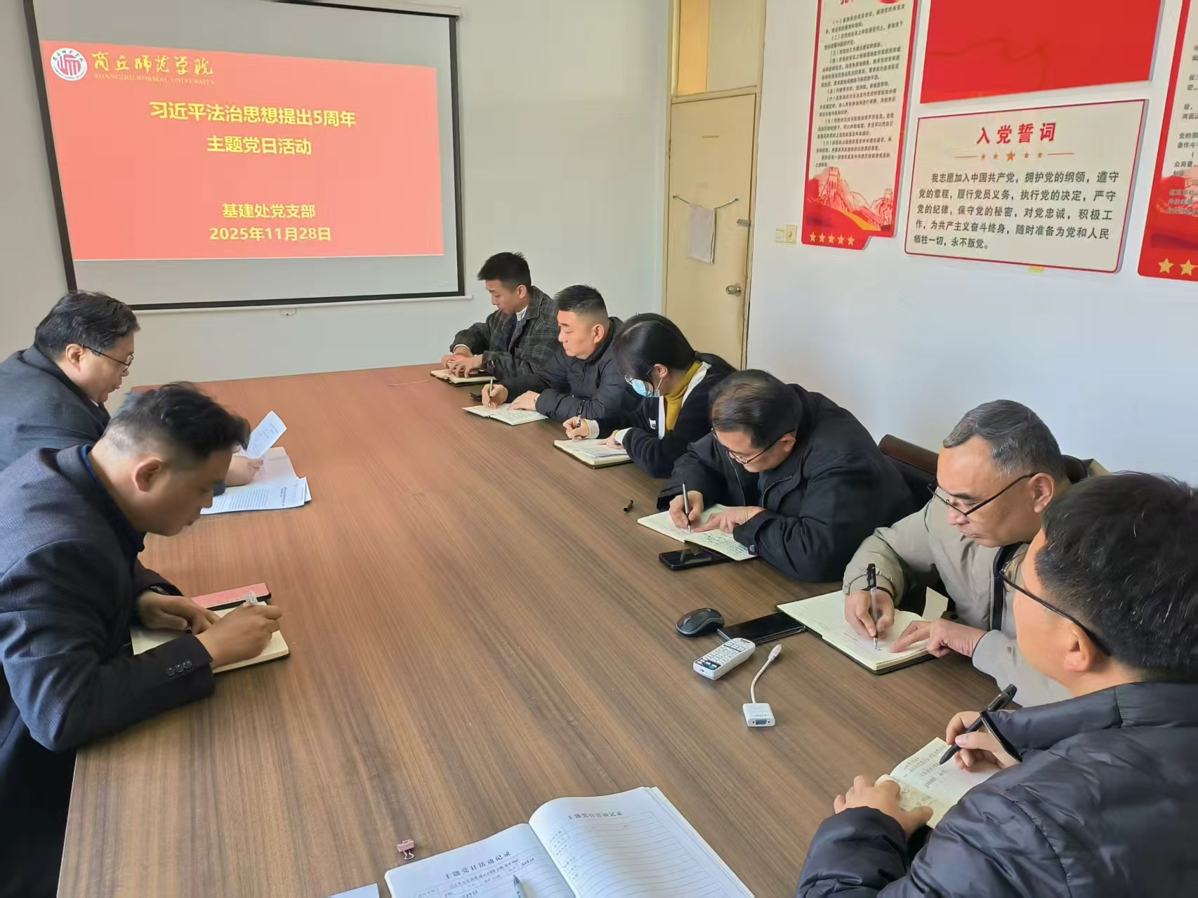 2025年11月28日,基建处党支部在会议室308室开展“习近平法治思想提出5周年”主题党日活动。
